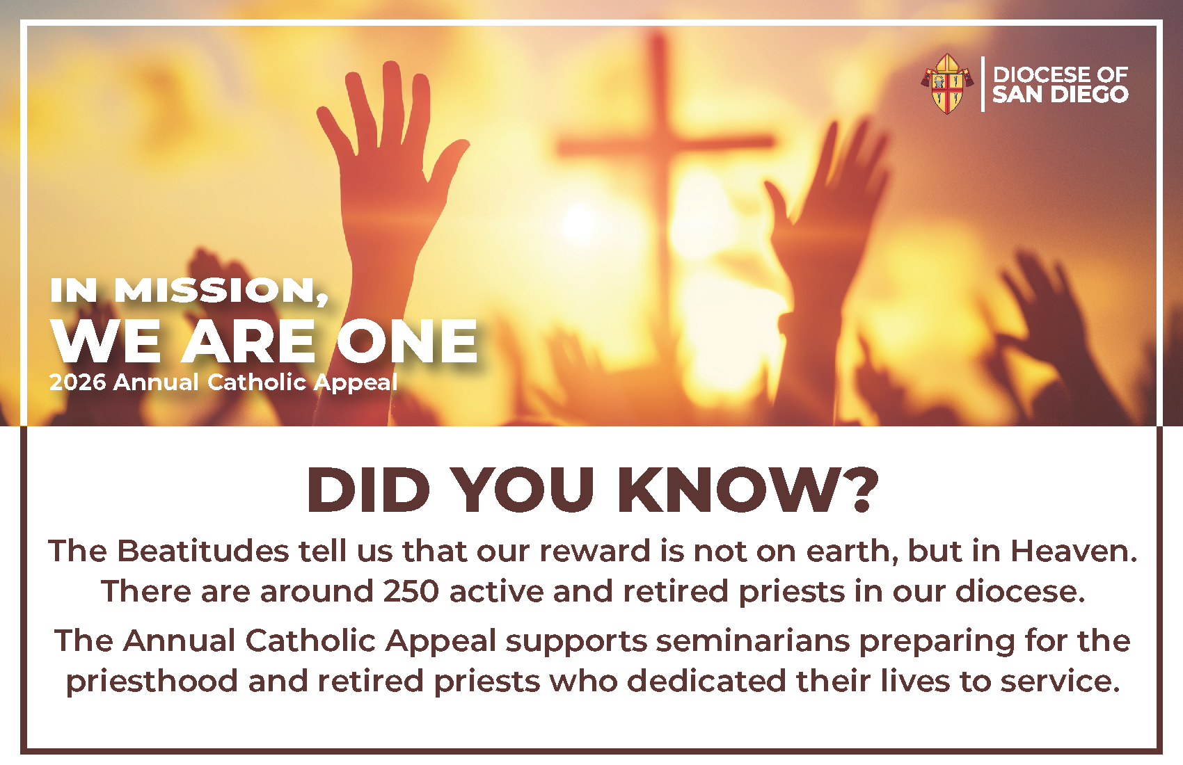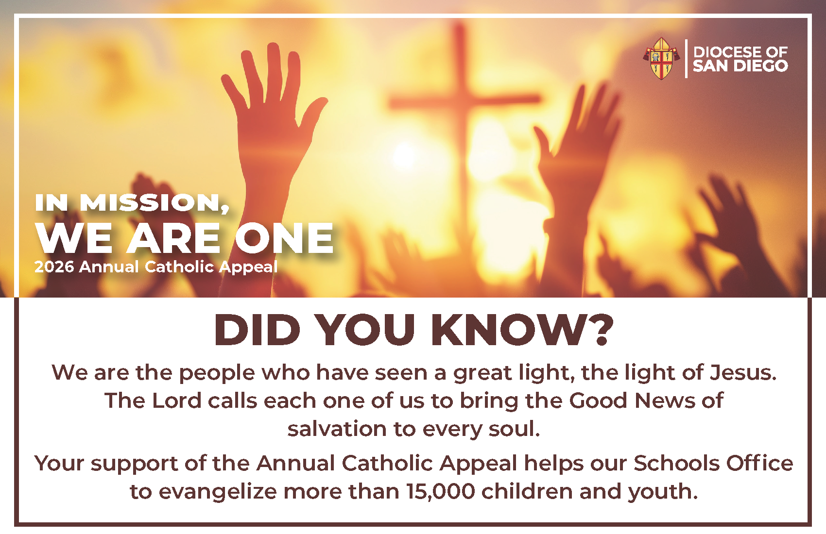 The 2026 Our Annual Catholic Appeal enables us to fund our pastoral center ministry offices and programs that help our community members to live their faith. They include our schools and programs to support faith formation at all ages, to strengthen families, to promote a culture of life, to care for creation, to engage youth and young adults, to assist the marginalized, to sustain our clergy and those preparing for the priesthood, and to extend a helping hand to the marginalized.