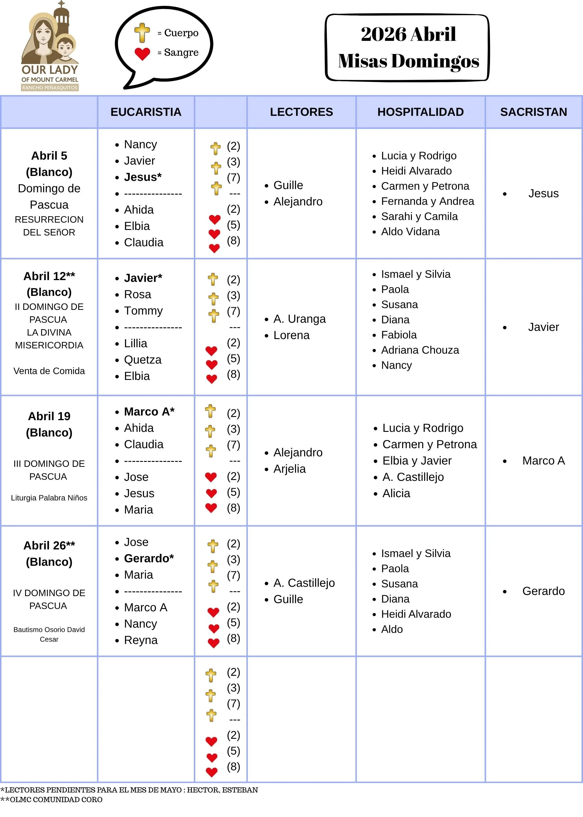 Our Lady of Mount Carmel Catholic Parish is one family in Christ. We: Love God and neighbor / Pray in the celebration of the Sacraments and receive grace / Serve sacrificially with time, talent and treasure / Proclaim the Good News of salvation. Empowered by the Holy Spirit, and with Mama Mary to help us, we journey in hope to Heaven.