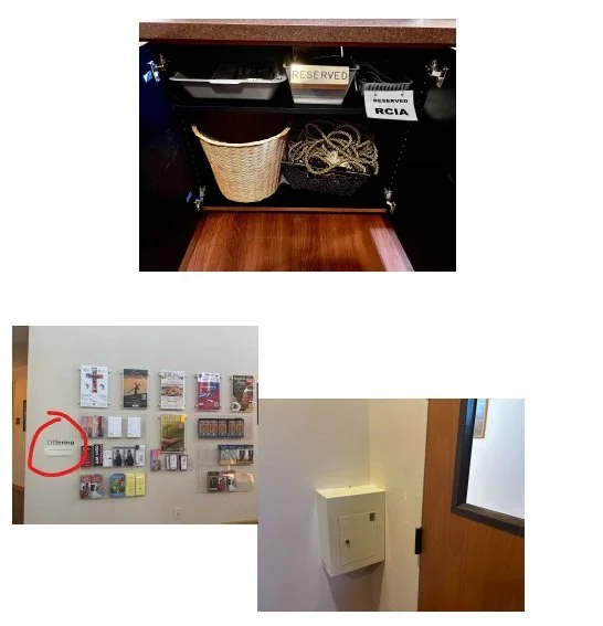 La carpeta BLANCA de la Colecta y la BOLSA YA ETIQUETADA Y NUMERADA se encuentran en la bandeja grande de plástico gris de este armario. Haga coincidir el número de la bolsa con la hora de la Misa en la hoja de la carpeta Y FIRME.